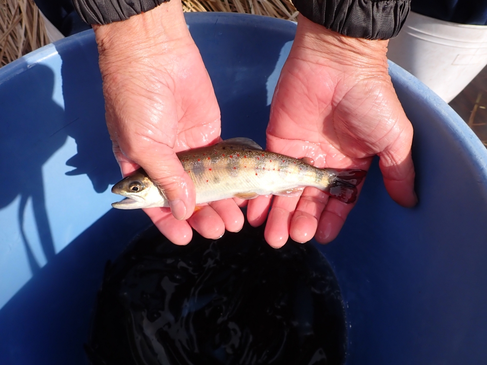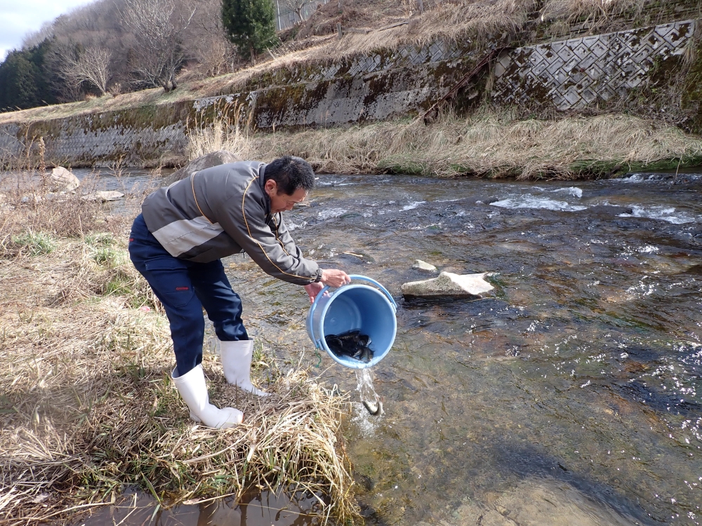 明日のアマゴ解禁に備えて、本日、河川全域にアマゴの成魚放流を行いました。