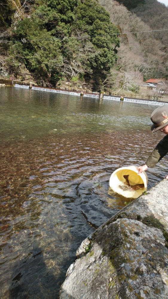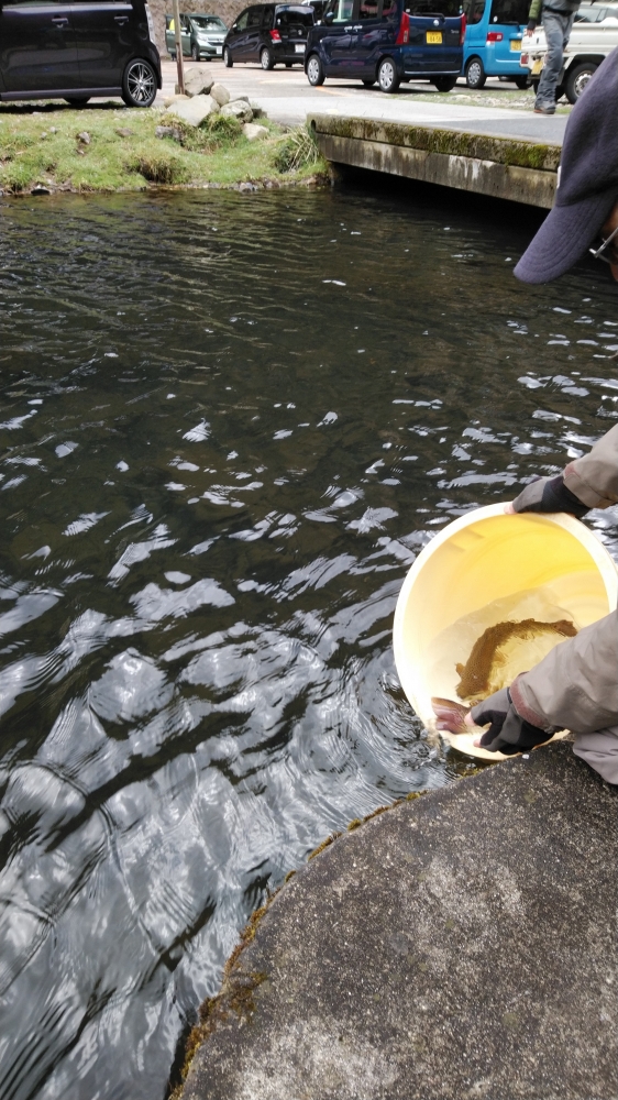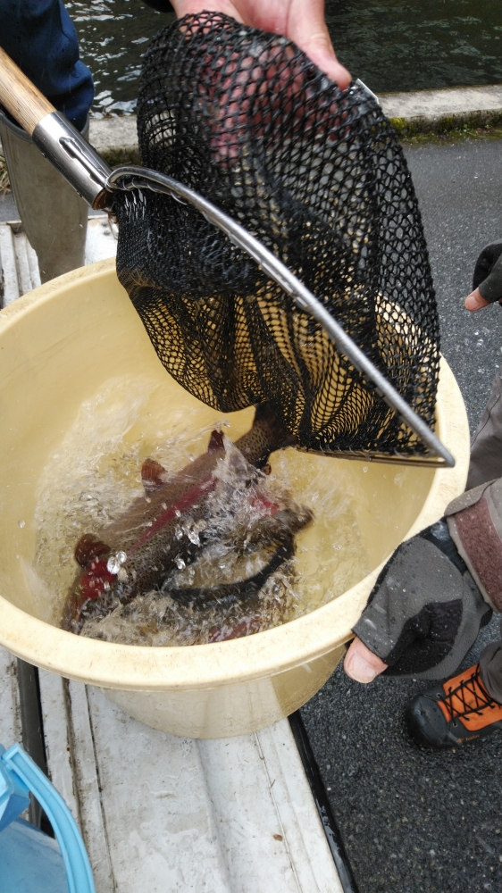 先日お知らせしました通り,昨日3月20日にフライエリアへのニジマスの成魚約40匹の放流を行いました。
