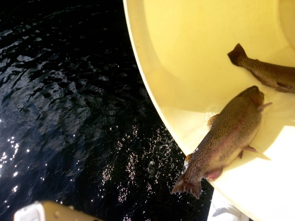 先日,11/19(日)に,当組合で育てたニジマスの3年魚を70尾(約40㎝)フライエリア内に放流しました。